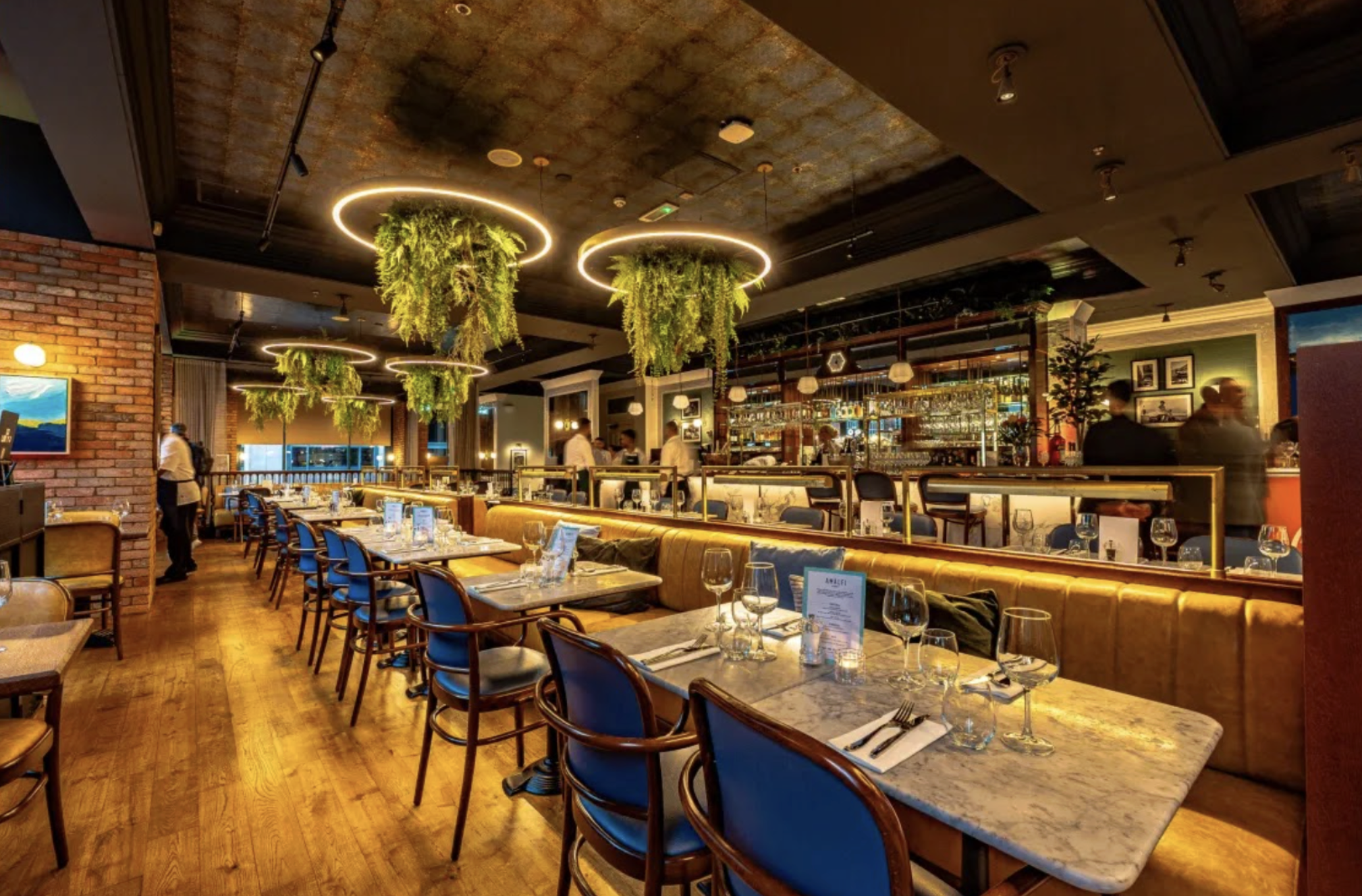 Just off Kensington High Street, Bottega 35 is guaranteed to please the most style-hungry diners. Inspired by Italian artisanal craftsmanship and the warmth of a Tuscan country home, this low-lit, fashion-forward restaurant is perfect for those drawn to clean, minimalist interiors punctuated by bold design features. Statement artwork, glowing feature lamps and moody lighting create a warm yet striking setting, ideal for anyone who loves a dining room without the fuss. Hand-rolled pasta and seafood-led dishes take centre stage, with standouts including the rich mafaldine, finished theatrically in a wheel of pecorino with truffle, delicately pan-seared seabass, tomato and capers. Every dish is designed to be enjoyed alongside Italian wines or well-balanced house cocktails. Our tip? Order the tiramisu prepared tableside, a spectacle that’s as good to watch as it is to eat.
