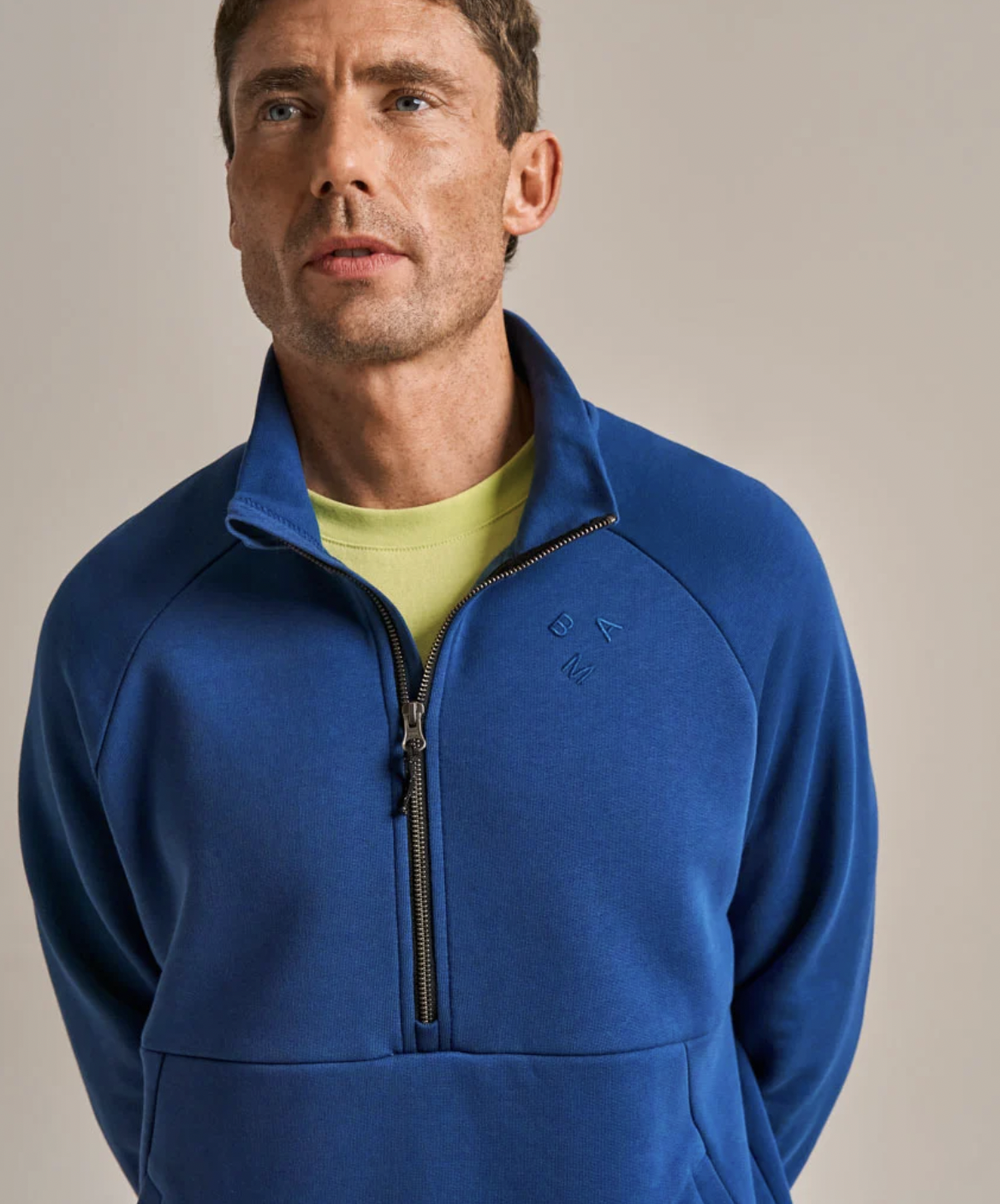 Elevate your activewear with the BAM Half Zip Sweat Top in Indigo Ink. Crafted from 100% organic cotton, this mid-weight sweatshirt features a brushed inner for exceptional softness and warmth. The practical half-zip design and kangaroo pocket add functionality, making it ideal for both workouts and casual outings.