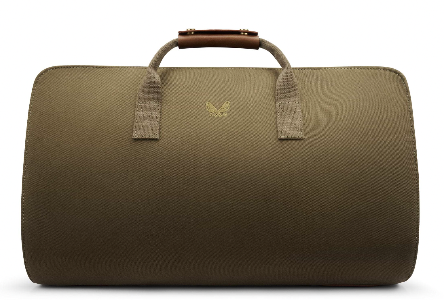 The Olive S.C. Holdall by Bennett Winch is a luxurious, travel-ready bag crafted in England. It features a clever two-piece design: a cylindrical central holdall wrapped by a detachable suit-carrier that secures with magnets and straps - keeping jackets and trousers crease-free. The outer is made from 24 oz waterproof British canvas, while the bag uses durable 18 oz canvas twill, enriched with Italian veg-tanned leather trim, solid brass hardware, and YKK zips.