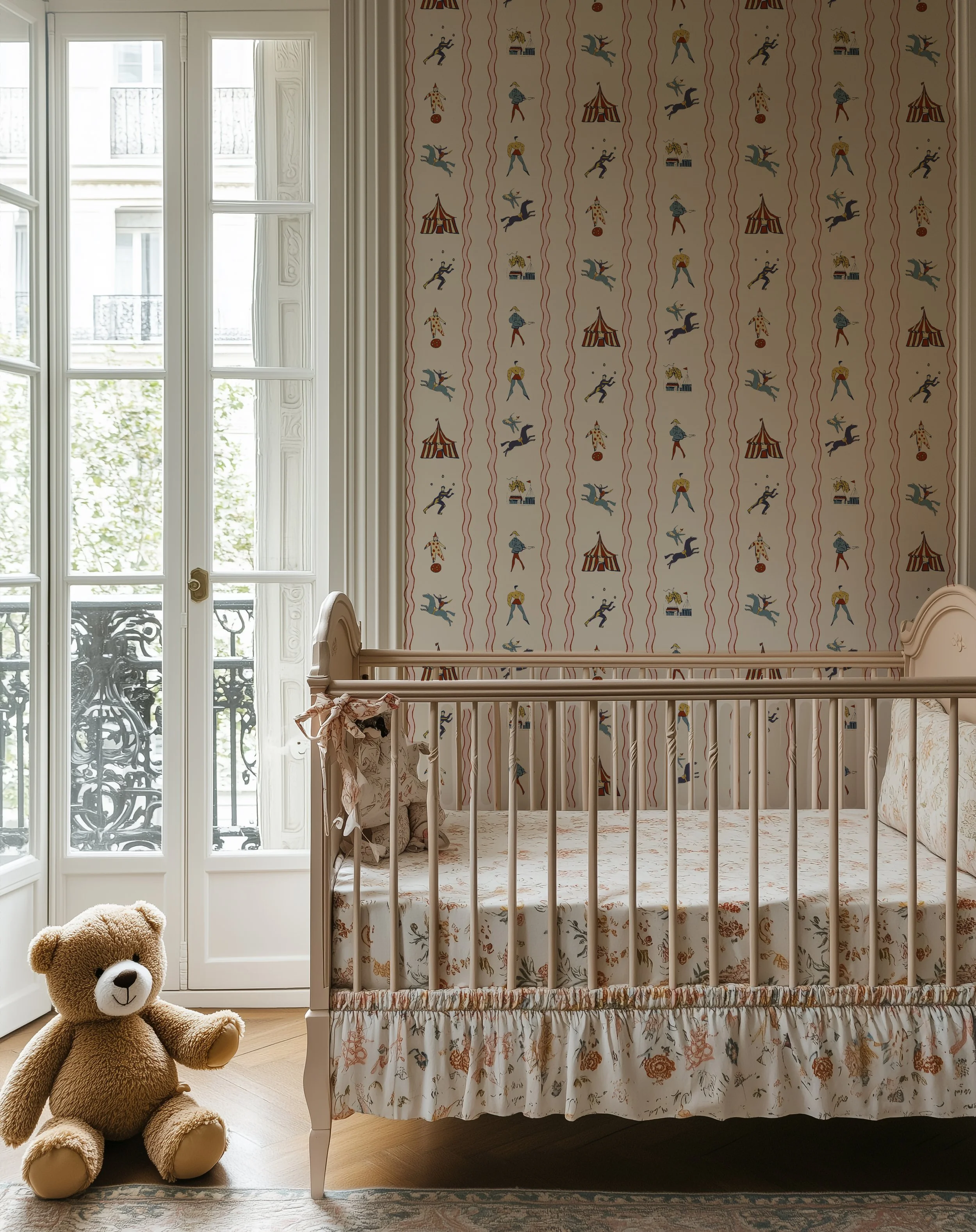Run Away to the Circus invites storytelling and imagination into the home, each stripe a window into the lively world of the circus, inspired by Picasso's Parade Ballet.